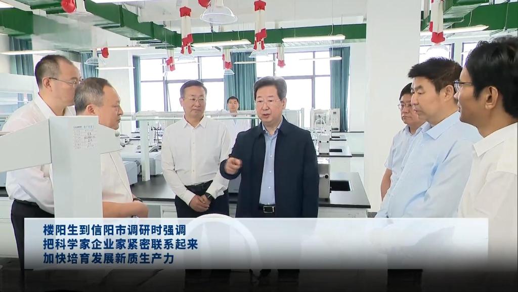 在谭山校区,楼阳生实地察看了大别山实验室服务中心、省茶树生物学重点实验室、实验科研综合楼,询问研发成果、应用前景等,鼓励科研人员潜心科研、专注创新,聚力攻克“两茶”领域关键核心技术,勇攀最高峰、抢占最前沿。他强调,要把科学家和企业家更加紧密联系起来,以实验室为龙头,以产品为标志,不断拓展新领域、开辟新赛道、培育新产业、发展新业态,加快形成新质生产力。在信阳理工学院,楼阳生察看实验室、产教融合中心,询问研究方向、人才培育等,指出要创新体制机制,引导高校、科研院所与企业密切合作,面向产业需求共同凝练科技问题、开展科研攻关、协同培养人才,打造贯通产学研用的科研实体,让创新资源更多走向生产一线。调研期间,楼阳生听取了学校事业发展、信阳理工学院建设情况汇报。校党委书记王文鹏在汇报中详细介绍了学校的基本情况和信阳理工学院的建设发展现状。王文鹏说,建校近50年来,学校扎根大别山革命老区办教育,一代代师大人始终铭记师范教育的使命担当,筚路蓝缕、艰苦创业,孜孜以求、勇毅前行,努力在挑战中找寻机遇,在曲折中砥砺奋进,在变革中谋求发展,为国家培养各类人才30余万人,为河南基础教育和地方经济社会发展做出重要贡献。王文鹏表示,近年来,学校全力推动更名大学、博士授权单位建设、校园空间拓展、高层次人才引进、大别山实验室建设、信阳理工学院建设等重点工作,取得了明显成效。学校将聚焦高水平师范大学建设,持续加快内涵式发展,建强平台、做强学科、育强人才,面向产业需求,优化学科布局,深化改革创新,促进科研成果转化,充分发挥高校科技、人才优势,积极服务地方经济社会发展,为新质生产力发展注入新活力,为高质量建设现代化河南作出新贡献!