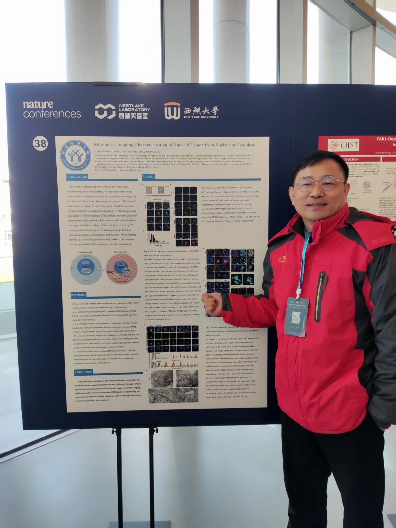 秦克周老师基于自身近期研究成果撰写的学术墙报,经大会组委会严格筛选后成功入选,并在会议现场进行展示。墙报内容聚焦于两种干细胞模型的成像特征,即Primed干细胞向Naïve干细胞转化过程中的“核仁出核”现象的首次发现。该研究工作采用多种成像手段,既体现了扎实的研究基础,也展现了创新的学术思路,吸引了众多参会学者驻足观看、交流探讨。在互动过程中,多位业内知名专家对该研究给予关注,其中一位专家在深入了解研究细节后评价道:“此项工作非常有意思”,高度认可研究的创新性与探索价值。我院秦老师不仅详细介绍了研究背景、方法与成果,同时认真听取同行及专家的意见建议,为后续研究工作的深化与拓展积累了宝贵经验。
