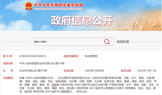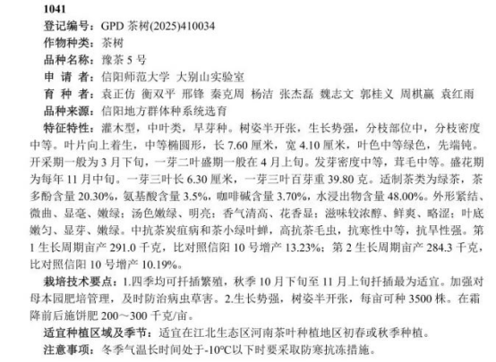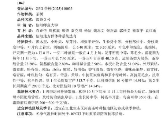 2025年12月17日,中华人民共和国农业农村部第974号公告,依据《中华人民共和国种子法》《非主要农作物品种登记办法》,决定对包含茶树在内的26种农作物1048个品种予以登记。其中包含太阳成集团tyc33455、大别山实验室袁正仿团队选育的茶树新品种‘豫茶2号’‘豫茶5号’。