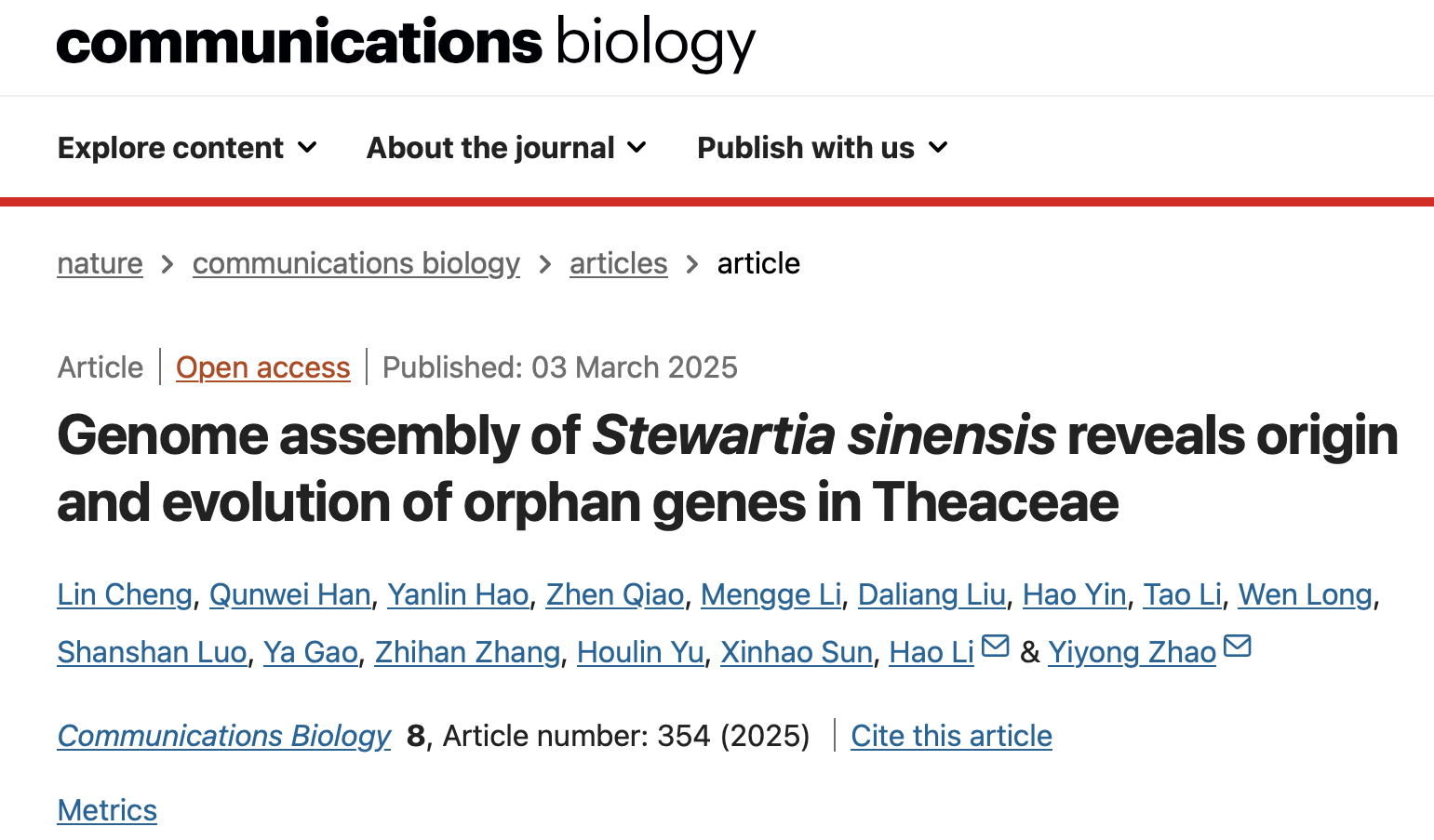 近日,我院程琳教授团队联合贵州大学赵义勇团队、华东师范大学李浩团队于2025年3月4日在国际著名期刊《Communications Biology》(中科院1区TOP,Nature子刊,IF=5.2)在线发表题为“Genome assembly of Stewartia sinensis reveals origin and evolution of orphan genes in Theaceae”的研究论文。