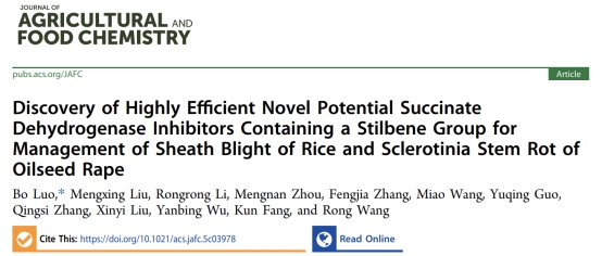 近日,我院罗波博士团队在国际知名的农林科学领域学术期刊《Journal of Agricultural and Food Chemistry》上发表了两篇学术论文。题目分别为《Discovery of novel pyrazole-4-carboxamide derivatives with thioether moiety as potential SDHI agents for crop protection》(DOI: 10.1021/acs.jafc.5c03082)和《Discovery of highly efficient novel potential SDHIs containing stilbenes group for management of sheath blight of rice and sclerotinia stem rot of oilseed rape》(DOI: 10.1021/acs.jafc.5c03978)。